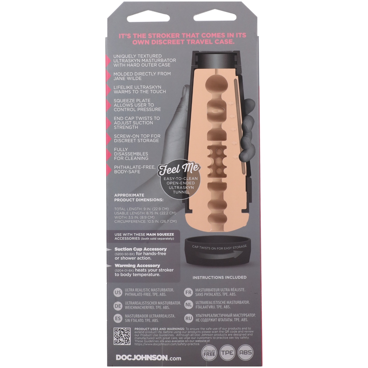 Bring home Jane Wilde with this Main Squeeze molded directly from her body. Handcrafted in lifelike ULTRASKYN inside a hard outer case Jane’s Main Squeeze features a tight textured interior that warms to the touch and feels just like the real thing. Approximate Product Dimensions: Total Length: 9 in. (22.9cm)Usable Length: 8.75 in. (22.2cm)Width/Diameter: 3.5 in. (8.9cm)Circumference: 10.5 in. (26.7cm)