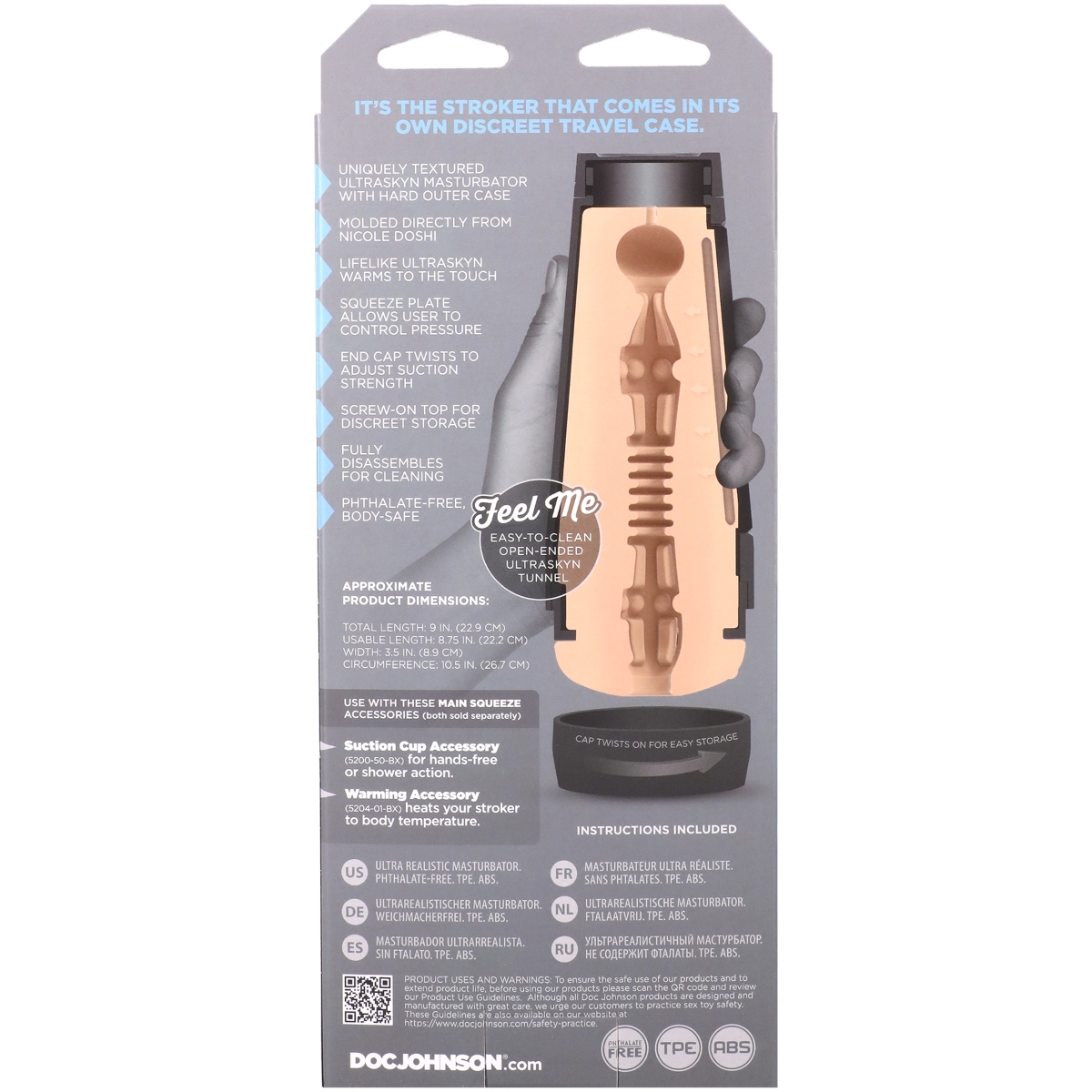 Nicole Doshi has joined the Main Squeeze lineup with a variable pressure hard-case stroker molded directly from her body. Handcrafted in lifelike ULTRASKYN Nicole’s Main Squeeze features a tight textured interior that warms to the touch and feels just like the real thing. Approximate Product Dimensions: Total Length: 9 in. (22.9cm)Usable Length: 8.75 in. (22.2cm)Width/Diameter: 3.5 in. (8.9cm)Circumference: 10.5 in. (26.7cm)